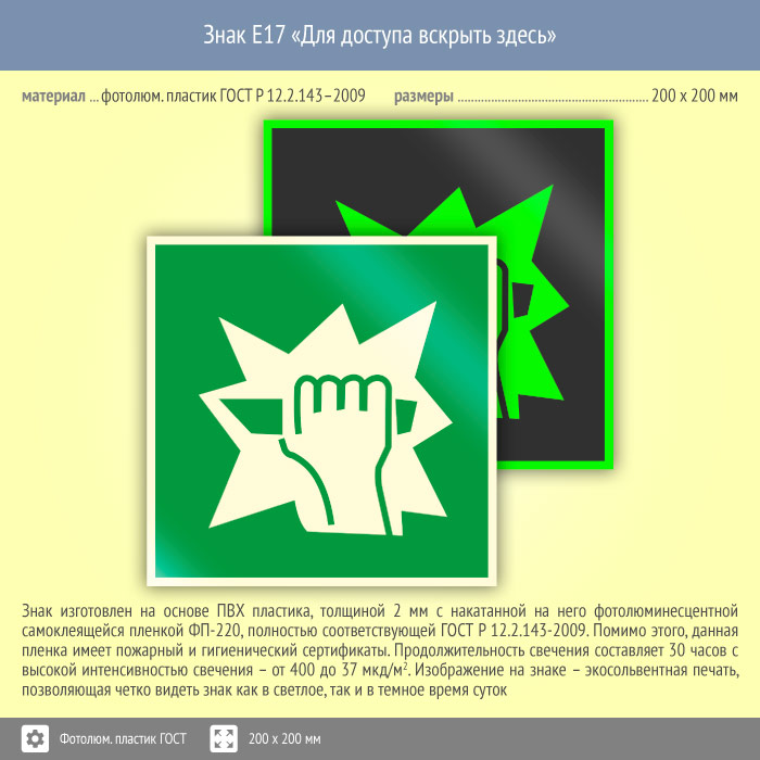 Знак E17 «Для доступа вскрыть здесь» (фотолюминесцентный пластик ГОСТ 34428-2018, 200х200 мм) в Кызыле купить