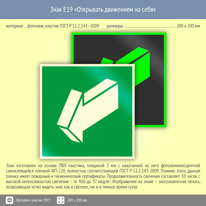 Знак E19 «Открывать движением на себя» (фотолюминесцентный пластик ГОСТ 34428-2018, 200х200 мм) в Кызыле купить