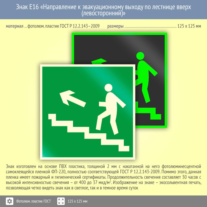 Знак E16 «Направление к эвакуационному выходу по лестнице вверх (левосторонний)» (фотолюминесцентный пластик ГОСТ 34428-2018, 125х125 мм) в Кызыле купить