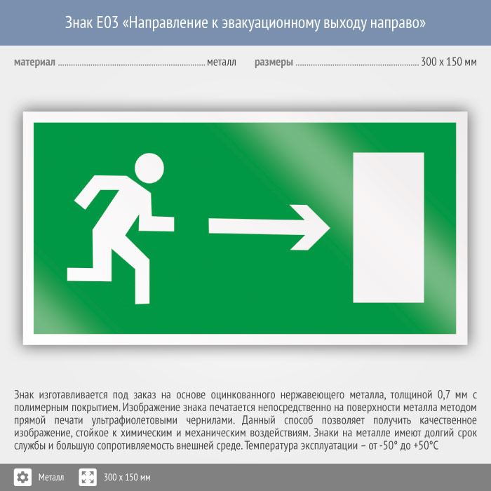 Знак E03 «Направление к эвакуационному выходу направо» (металл, 300х150 мм) в Кызыле купить