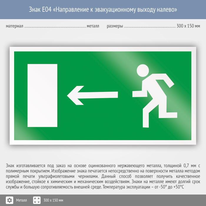 Знак E04 «Направление к эвакуационному выходу налево» (металл, 300х150 мм) в Кызыле купить