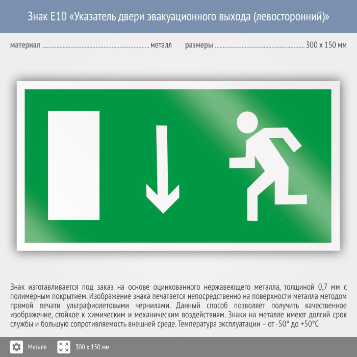 Знак E10 «Указатель двери эвакуационного выхода (левосторонний)» (металл, 300х150 мм) в Кызыле купить