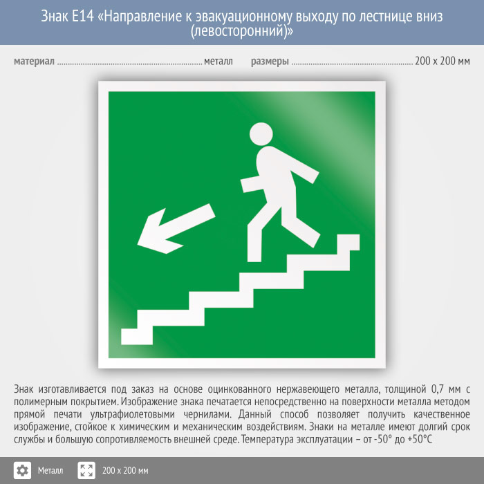 Знак E14 «Направление к эвакуационному выходу по лестнице вниз (левосторонний)» (металл, 200х200 мм) в Кызыле купить