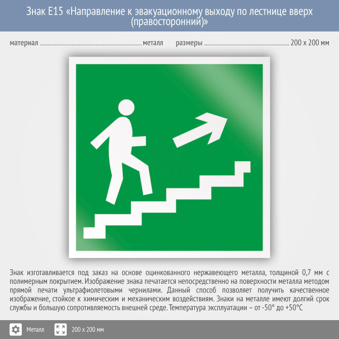Знак E15 «Направление к эвакуационному выходу по лестнице вверх (правосторонний)» (металл, 200х200 мм) в Кызыле купить