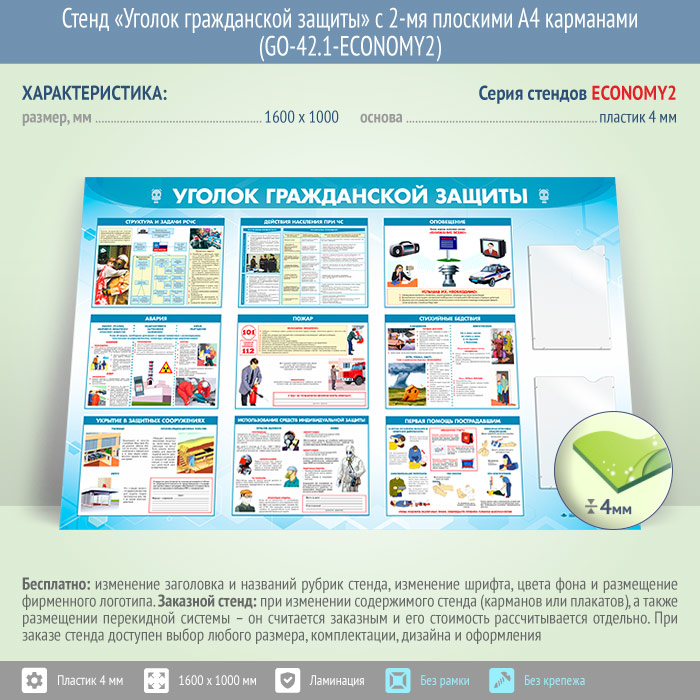 Стенд «Уголок гражданской защиты» с 2-мя плоскими А4 карманами (GO-42.1-ECONOMY2) в Кызыле купить