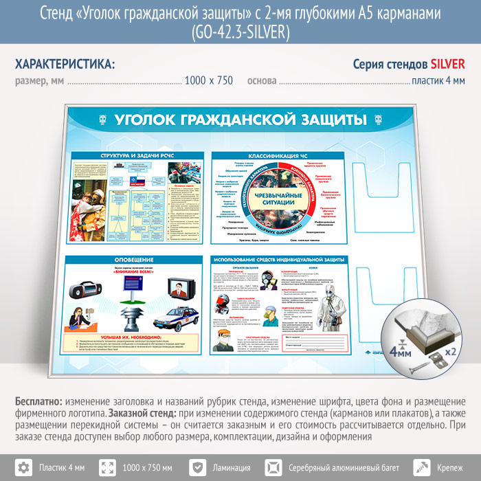 Стенд «Уголок гражданской защиты» с 2-мя глубокими А5 карманами (GO-42.3-SILVER) в Кызыле купить