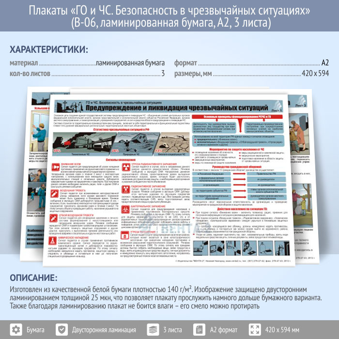 Плакаты «ГО и ЧС. Безопасность в чрезвычайных ситуациях» (В-06, ламинированная бумага, А2, 3 листа) в Кызыле купить