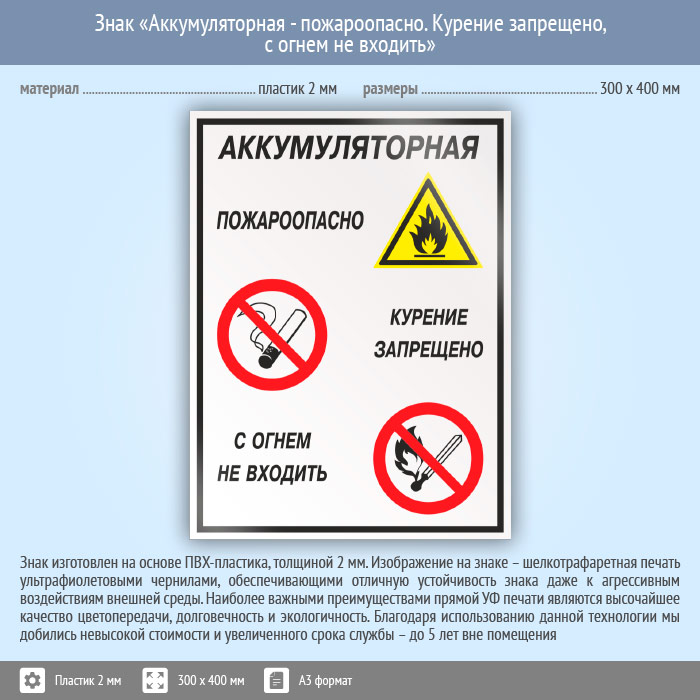 Знак «Аккумуляторная - пожароопасно. Курение запрещено, с огнем не входить», КЗ-01 (пластик, 300х400 мм) в Кызыле купить
