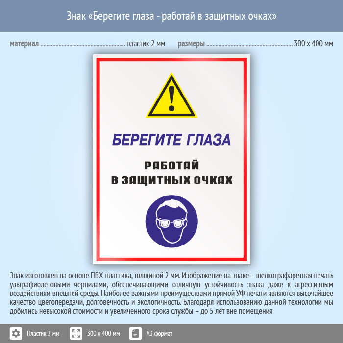 Знак «Берегите глаза - работай в защитных очках», КЗ-04 (пластик, 300х400 мм) в Кызыле купить