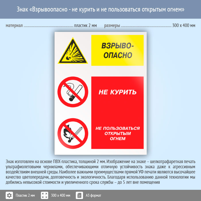 Знак «Взрывоопасно - не курить и не пользоваться открытым огнем», КЗ-08 (пластик, 300х400 мм) в Кызыле купить