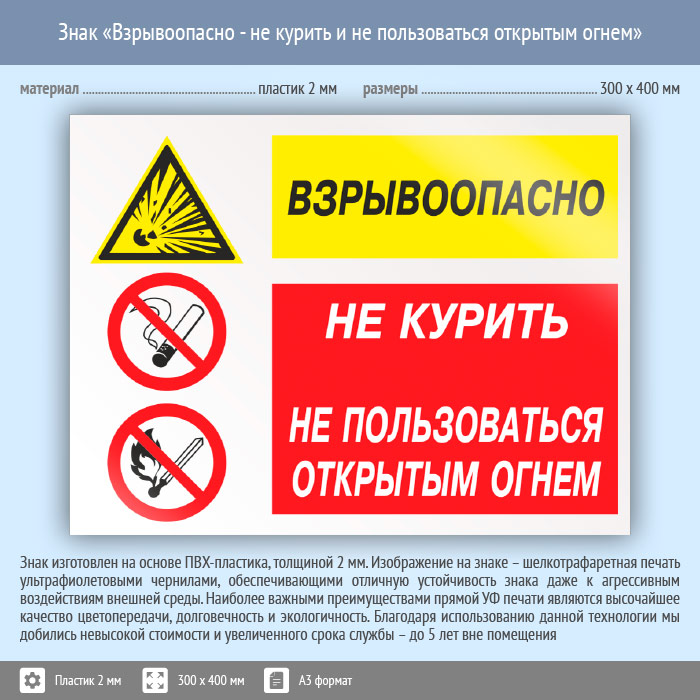 Знак «Взрывоопасно - не курить и не пользоваться открытым огнем», КЗ-09 (пластик, 400х300 мм) в Кызыле купить