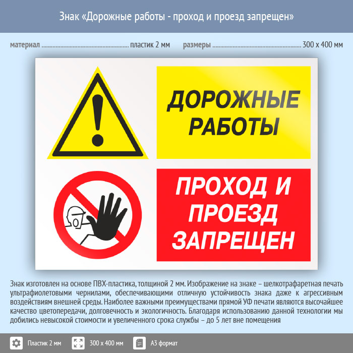 Знак «Дорожные работы - проход и проезд запрещен», КЗ-20 (пластик, 400х300 мм) в Кызыле купить