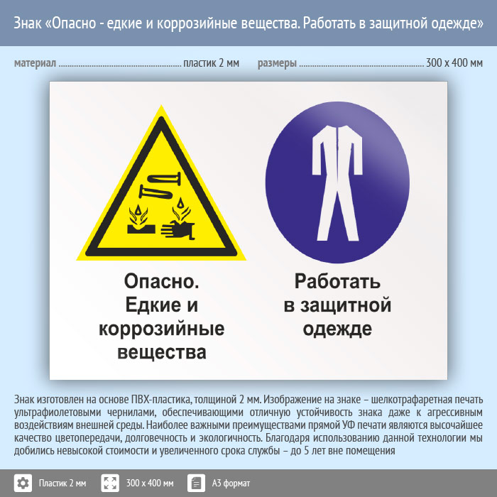Знак «Опасно - едкие и коррозийные вещества. Работать в защитной одежде», КЗ-35 (пластик, 400х300 мм) в Кызыле купить