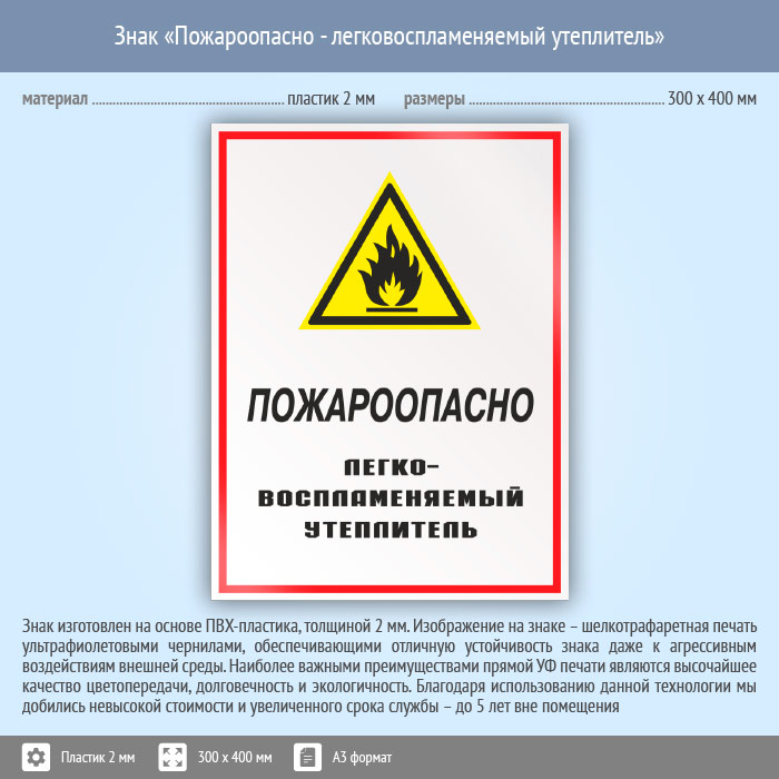 Знак «Пожароопасно - легковоспламеняемый утеплитель», КЗ-68 (пластик, 300х400 мм) в Кызыле купить