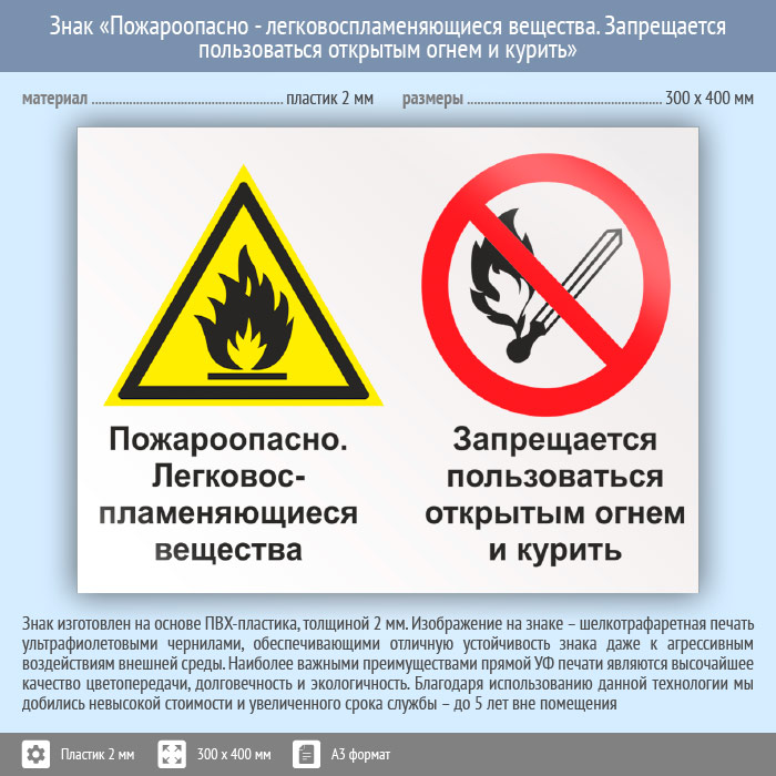 Знак «Пожароопасно - легковоспламеняющиеся вещества. Запрещается пользоваться открытым огнем и курить», КЗ-70 (пластик, 400х300 мм) в Кызыле купить
