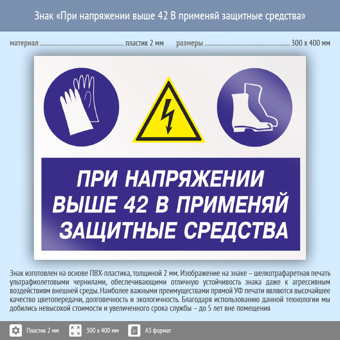 Знак «При напряжении выше 42 В применяй защитные средства», КЗ-72 (пластик, 400х300 мм) в Кызыле купить