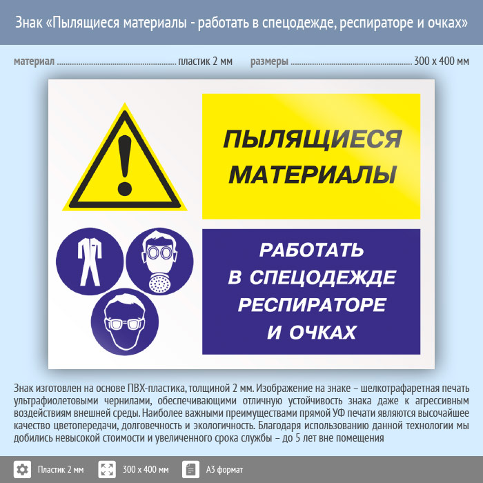 Знак «Пылящиеся материалы - работать в спецодежде, респираторе и очках», КЗ-79 (пластик, 400х300 мм) в Кызыле купить