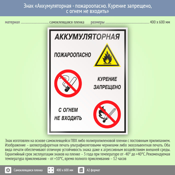 Знак «Аккумуляторная - пожароопасно. Курение запрещено, с огнем не входить», КЗ-01 (пленка, 400х600 мм) в Кызыле купить