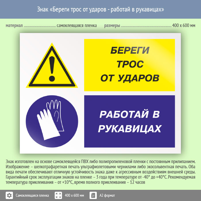 Знак «Береги трос от ударов - работай в рукавицах», КЗ-03 (пленка, 600х400 мм) в Кызыле купить