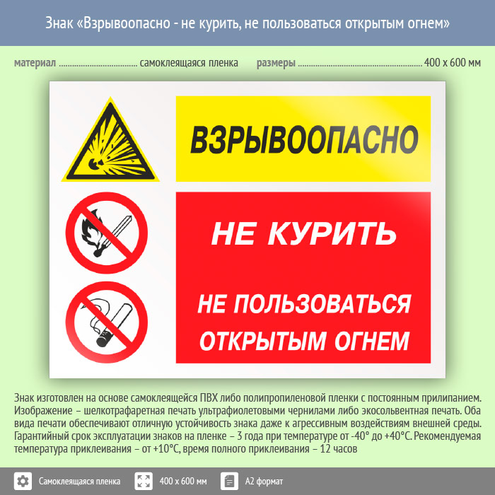 Знак «Взрывоопасно - не курить, не пользоваться открытым огнем», КЗ-05 (пленка, 600х400 мм) в Кызыле купить
