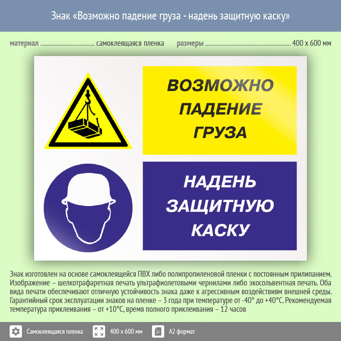 Знак «Возможно падение груза - надень защитную каску», КЗ-17 (пленка, 600х400 мм) в Кызыле купить