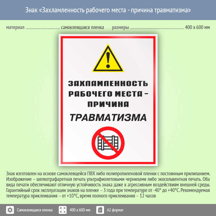 Знак «Захламленность рабочего места - причина травматизма», КЗ-21 (пленка, 400х600 мм) в Кызыле купить