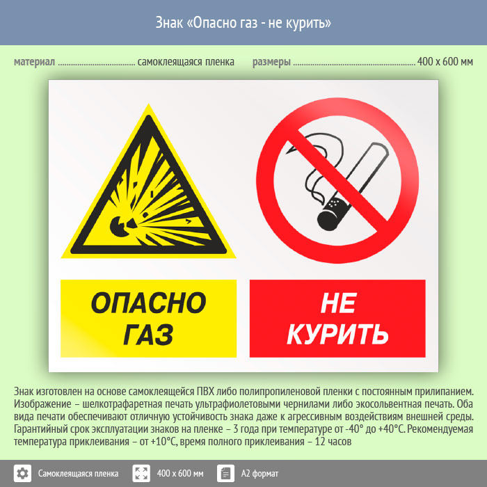 Знак «Опасно газ - не курить», КЗ-44 (пленка, 600х400 мм) в Кызыле купить