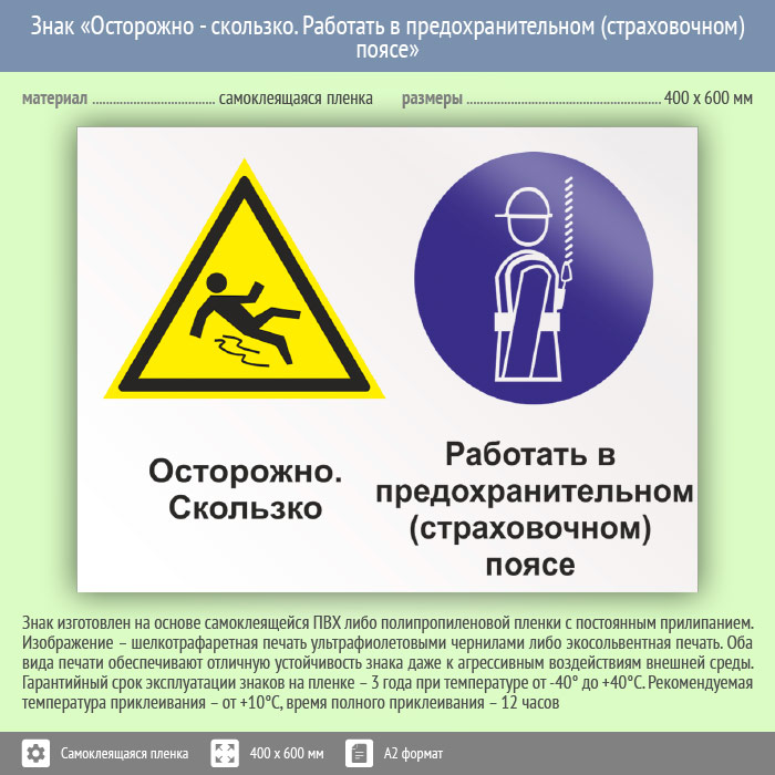 Знак «Осторожно - скользко. Работать в предохранительном (страховочном) поясе», КЗ-58 (пленка, 600х400 мм) в Кызыле купить