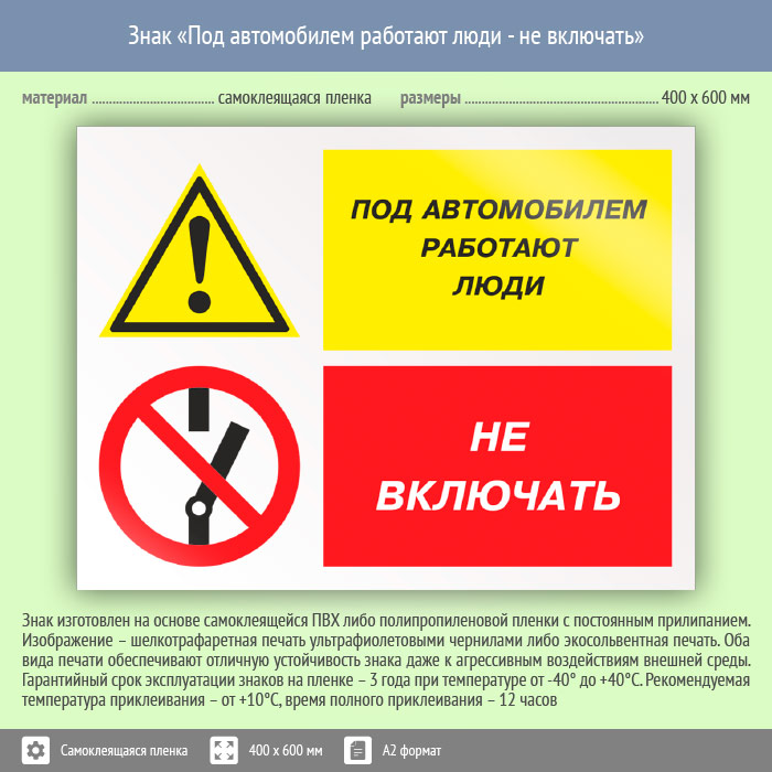 Знак «Под автомобилем работают люди - не включать», КЗ-65 (пленка, 600х400 мм) в Кызыле купить
