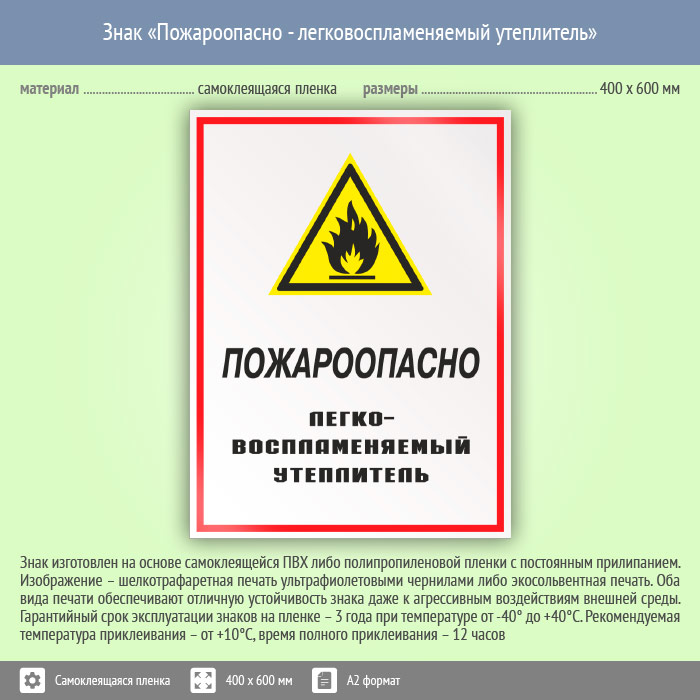 Знак «Пожароопасно - легковоспламеняемый утеплитель», КЗ-68 (пленка, 400х600 мм) в Кызыле купить