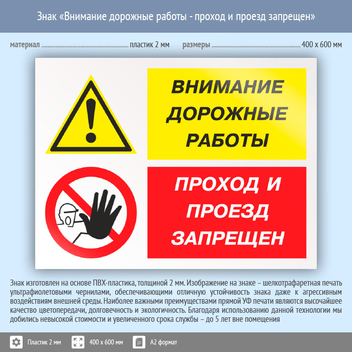Знак «Внимание дорожные работы - проход и проезд запрещен», КЗ-14 (пластик, 600х400 мм) в Кызыле купить