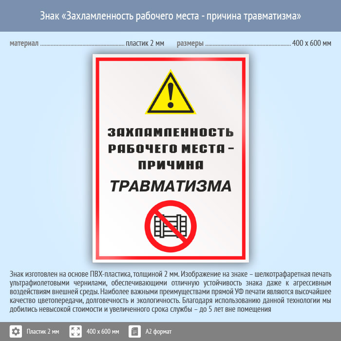 Знак «Захламленность рабочего места - причина травматизма», КЗ-21 (пластик, 400х600 мм) в Кызыле купить