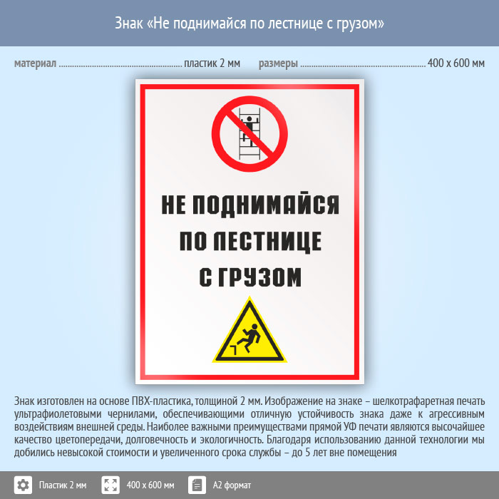 Знак «Не поднимайся по лестнице с грузом», КЗ-28 (пластик, 400х600 мм) в Кызыле купить