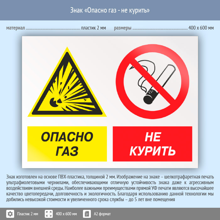 Знак «Опасно газ - не курить», КЗ-44 (пластик, 600х400 мм) в Кызыле купить