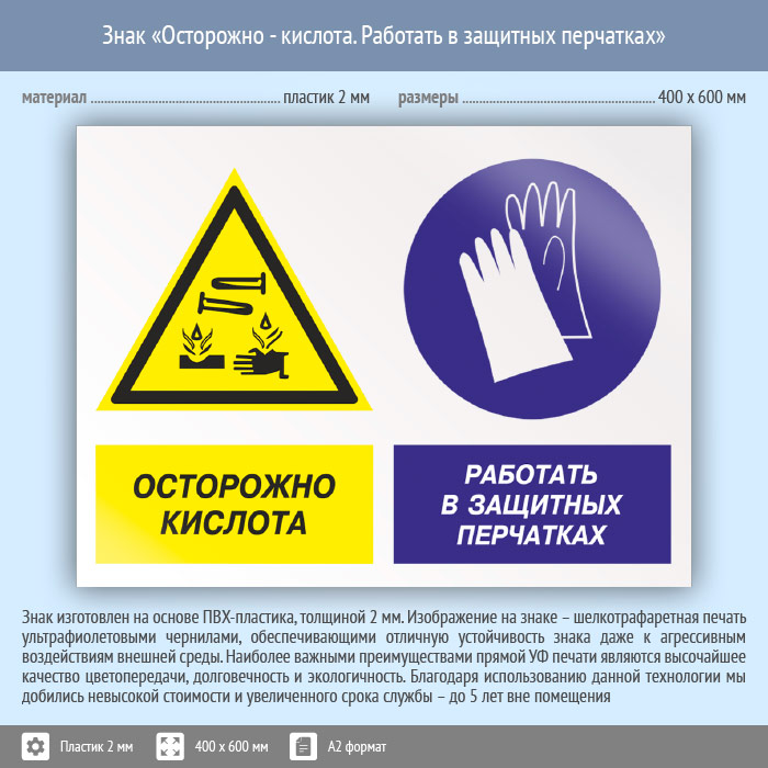Знак «Осторожно - кислота. Работать в защитных перчатках», КЗ-56 (пластик, 600х400 мм) в Кызыле купить