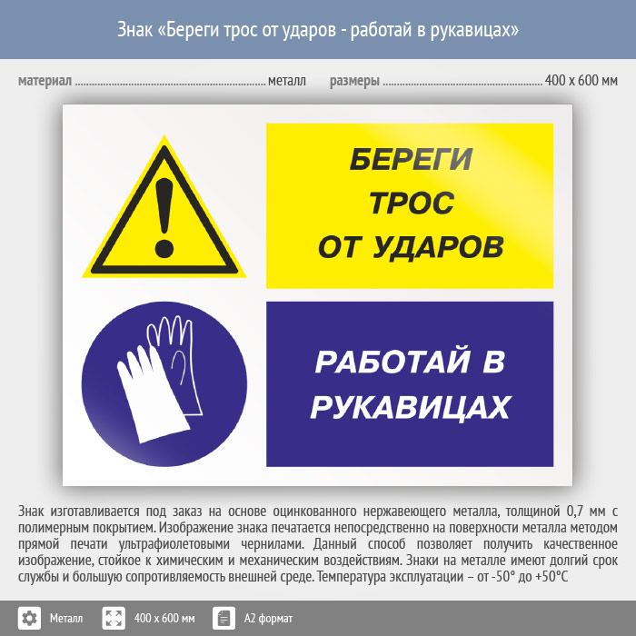 Знак «Береги трос от ударов - работай в рукавицах», КЗ-03 (металл, 600х400 мм) в Кызыле купить