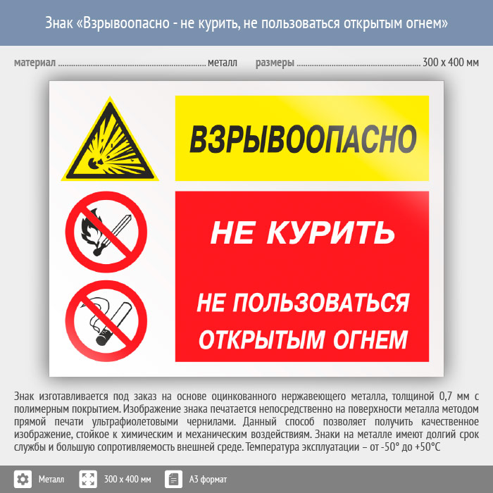 Знак «Взрывоопасно - не курить, не пользоваться открытым огнем», КЗ-05 (металл, 400х300 мм) в Кызыле купить