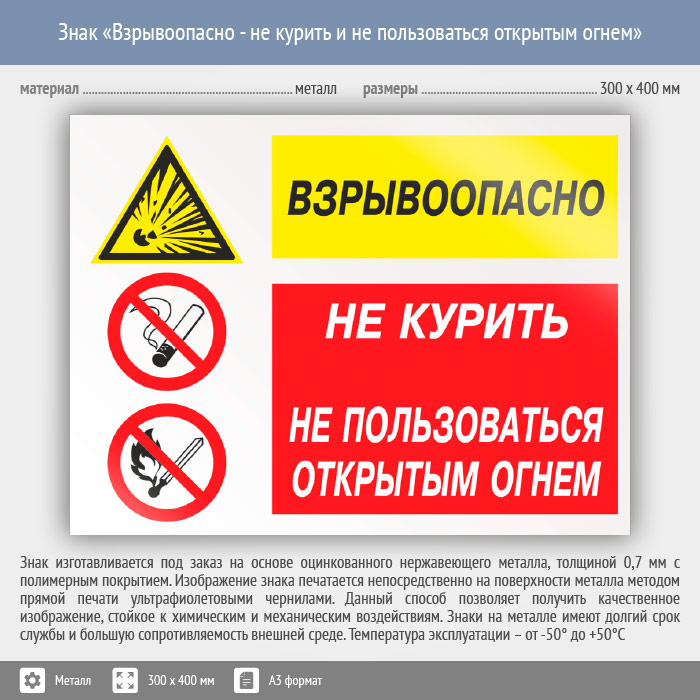 Знак «Взрывоопасно - не курить и не пользоваться открытым огнем», КЗ-09 (металл, 400х300 мм) в Кызыле купить