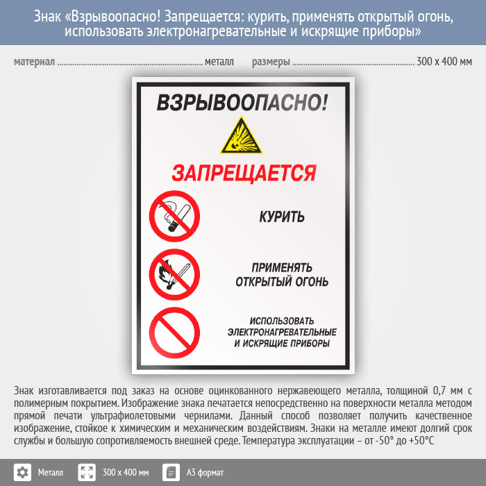 Знак «Взрывоопасно! Запрещается: курить, применять открытый огонь, использовать электронагревательные и искрящие приборы», КЗ-10 (металл, 300х400 мм) в Кызыле купить