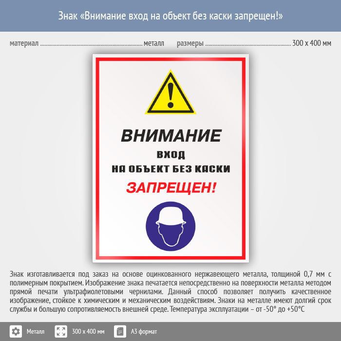 Знак «Внимание вход на объект без каски запрещен!», КЗ-13 (металл, 300х400 мм) в Кызыле купить
