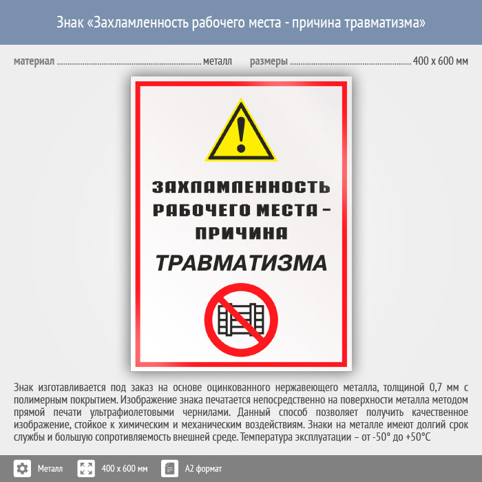 Знак «Захламленность рабочего места - причина травматизма», КЗ-21 (металл, 400х600 мм) в Кызыле купить