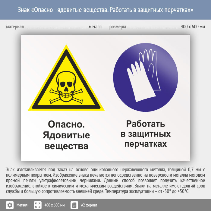 Знак «Опасно - ядовитые вещества. Работать в защитных перчатках», КЗ-43 (металл, 600х400 мм) в Кызыле купить