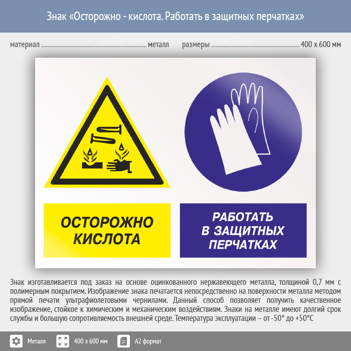 Знак «Осторожно - кислота. Работать в защитных перчатках», КЗ-56 (металл, 600х400 мм) в Кызыле купить