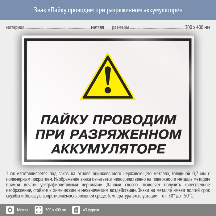 Знак «Пайку проводим при разряженном аккумуляторе», КЗ-62 (металл, 400х300 мм) в Кызыле купить