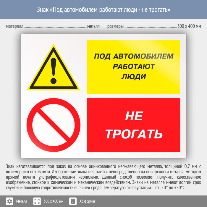 Знак «Под автомобилем работают люди - не трогать», КЗ-66 (металл, 400х300 мм) в Кызыле купить