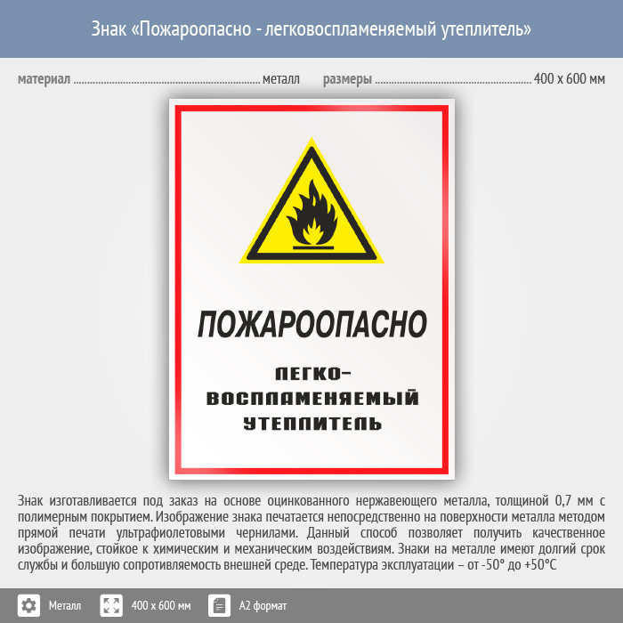 Знак «Пожароопасно - легковоспламеняемый утеплитель», КЗ-68 (металл, 400х600 мм) в Кызыле купить