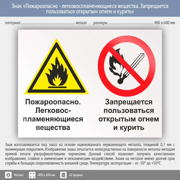 Знак «Пожароопасно - легковоспламеняющиеся вещества. Запрещается пользоваться открытым огнем и курить», КЗ-70 (металл, 600х400 мм) в Кызыле купить