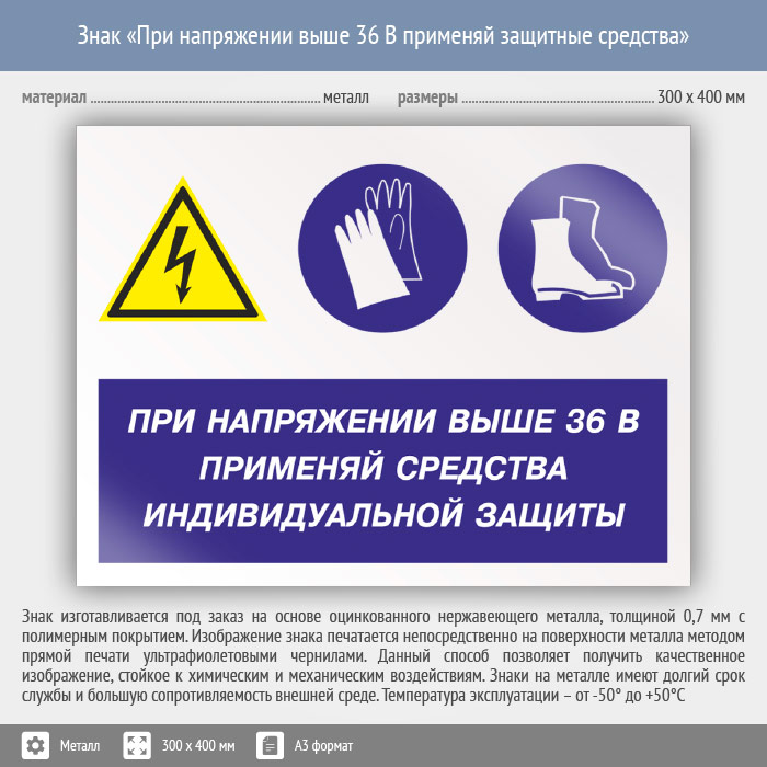 Знак «При напряжении выше 36 В применяй защитные средства», КЗ-71 (металл, 400х300 мм) в Кызыле купить