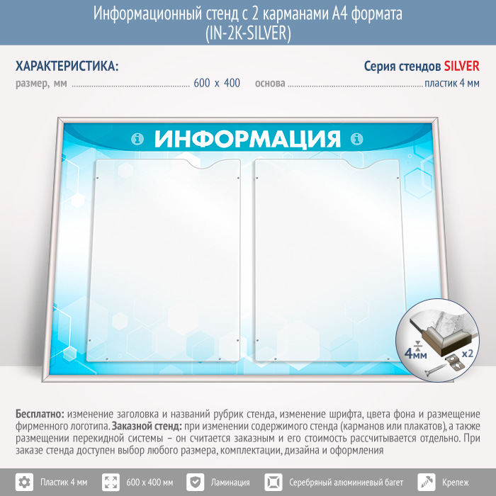 Информационный стенд с 2 карманами А4 формата (IN-2K-SILVER) в Кызыле купить