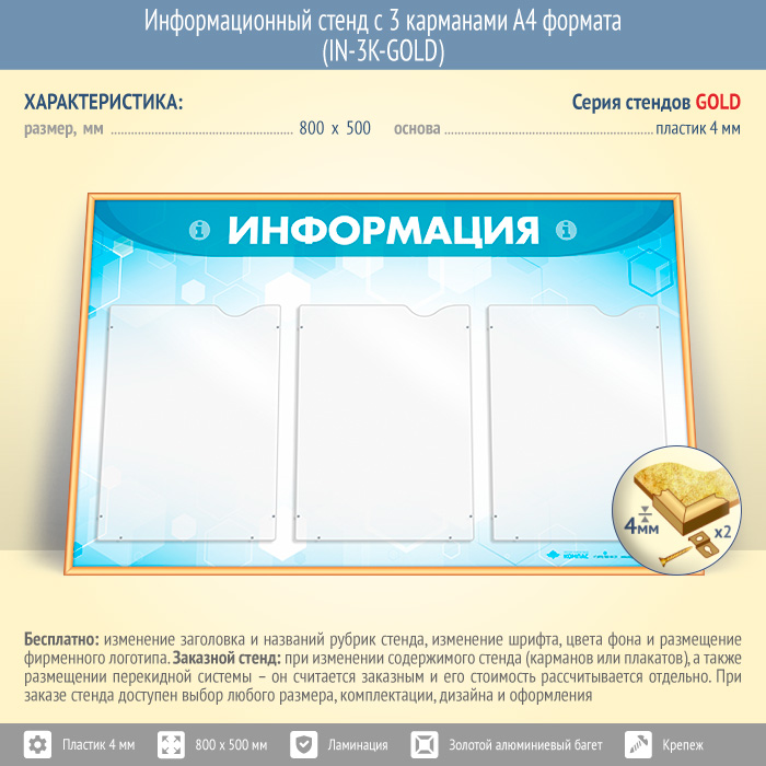 Информационный стенд с 3 карманами А4 формата (IN-3K-GOLD) в Кызыле купить